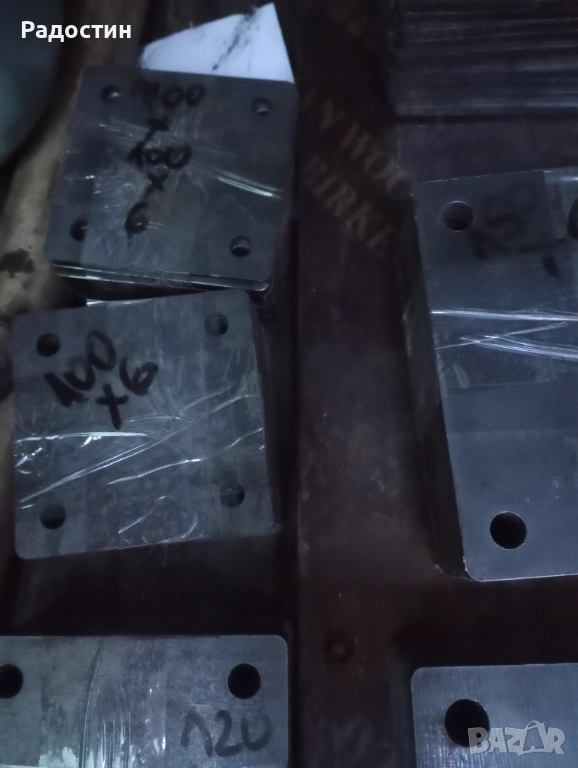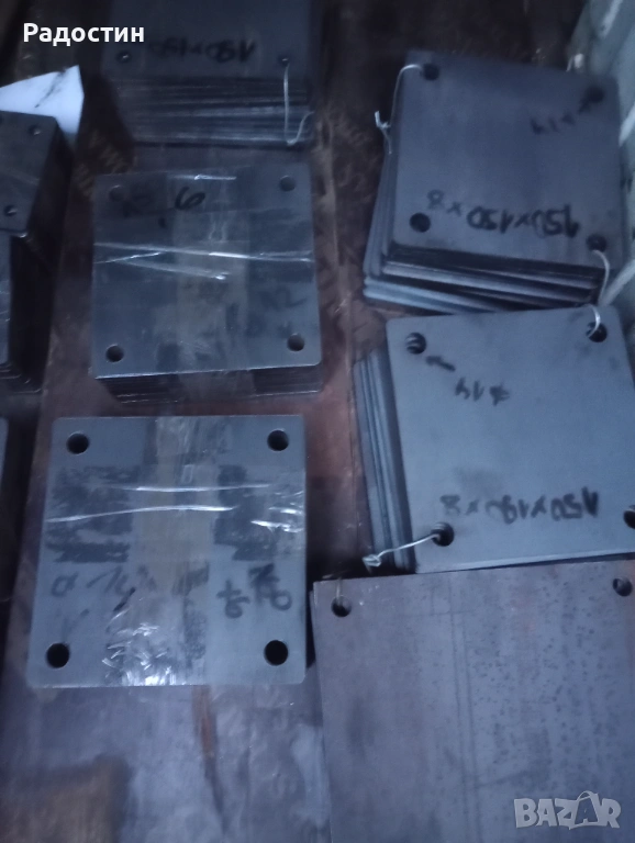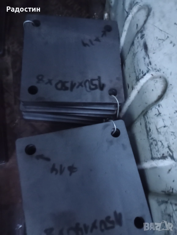 Метални планки от 6 мм.ламарина с отвори ф12-110/110-2.60евро,100/100-2.60,120/120-2.70,140/140-2.90,150/150-3,160/160-3.20,200*200-3.50евроОт 8мм. ламарина 150/150-3.50,200*200-4 евро с отвори ф 12 или ф14.Може да бъдат изработени планки с всякакви размери и дебелини.
