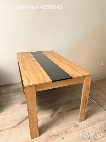 Трапезна маса с вградена черна вложка. Масата е нова. Подходяща за модерен интериор, ще придаде стилен и елегантен вид на всяка трапезария.