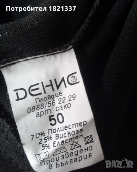 Черно дамско сако с джобове и ревери. Произведено в България, фирма Денис. Размер 50. Състав: 70% полиестер 25% вискоза и 5% еластан.
