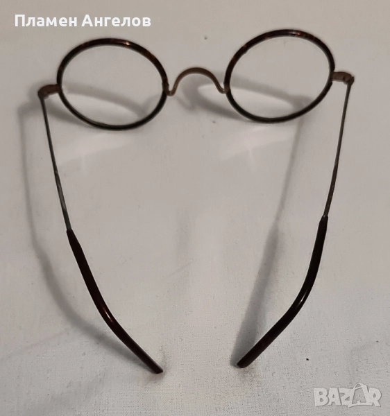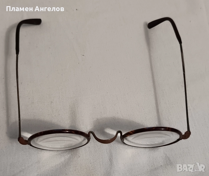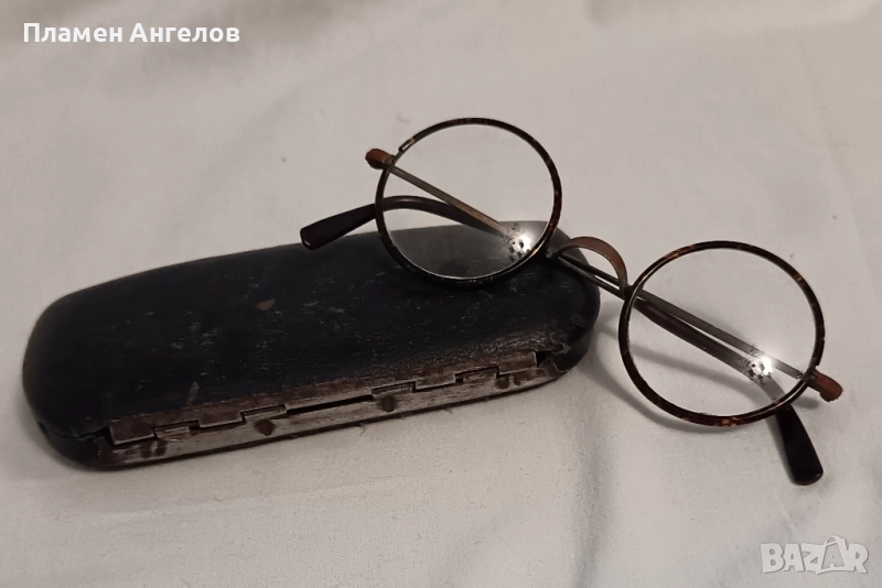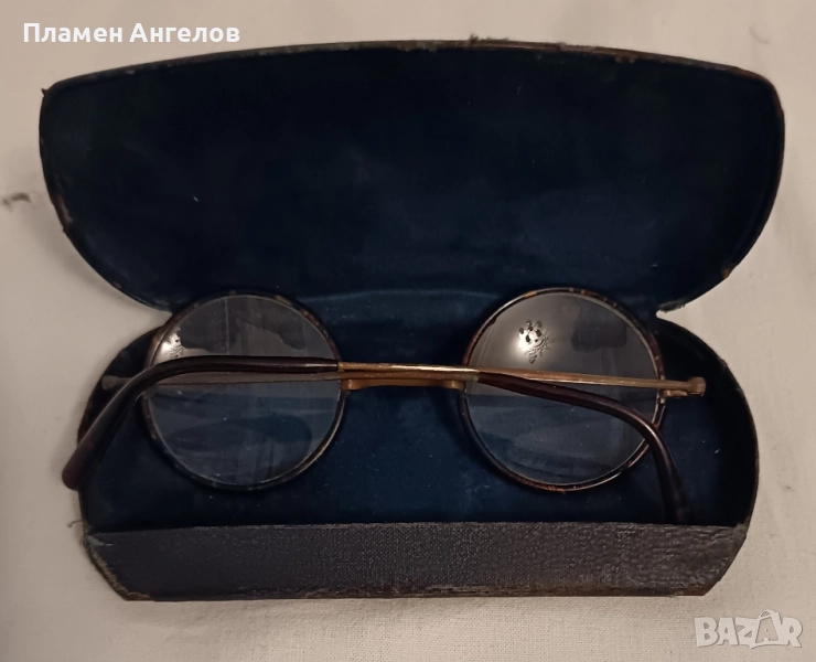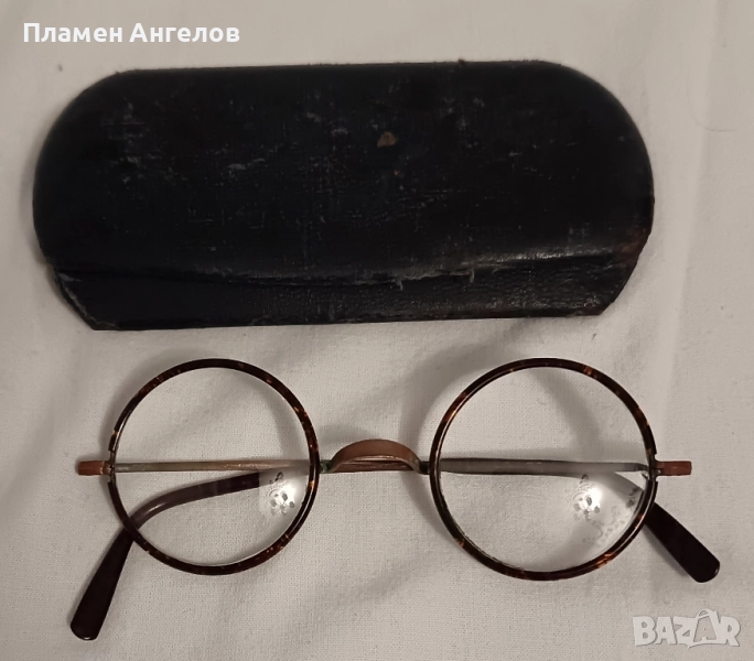 Стари кръгли, диоптрични очила, дизайнът им с тънки метални рамки (навярно някога са били посребрени сега е останало повече медното покритие). Бакелитови рамки на стъклата. Известни са още като "Уиндзор". Появяват се през 19 век, през 60те, 70те години на миналия век отново са популярни винтидж аксесоар или като част от модерния ретро стил. Ретро очила от 60те години с метална кутия със кадифе. Запазени без повреди, без драскотинки по стъклата. В отлично състояние за годините си. Цената е без коментар-твърда.