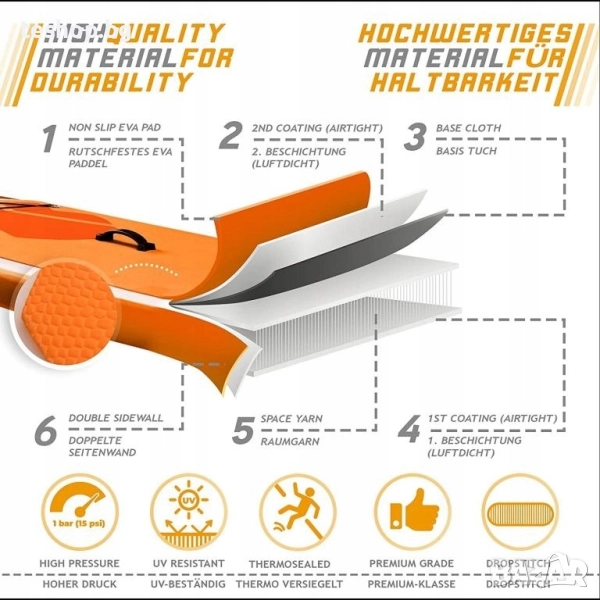 Нашата невероятно здрава дъска осигурява подобрена стабилност, идеална за крайбрежни преходи, йога практики или интензивна тренировъчна програма. Този продукт е изработен от подсилен PVC. Нашата дъска разполага с достатъчно място за съхранение, тройна долна плоча за плавници, D-образен пръстен и каишка за глезена, практична дръжка и неплъзгаща се, мека EVA пяна с широка основа.