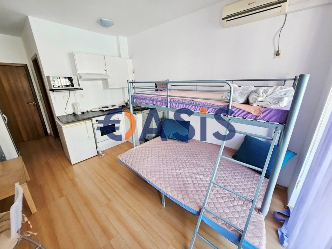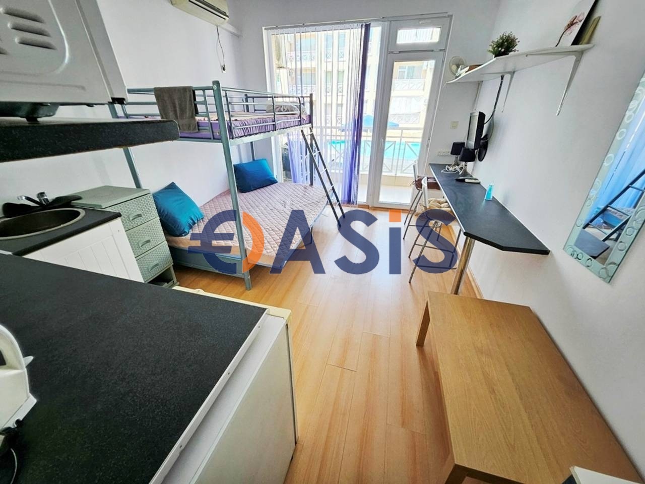 Предлагаме студио апартамент за продажба. Апартаментът се състои от входно антре, стая с кухненски бокс,двуетажно легло и кът за сядане, баня и тераса.