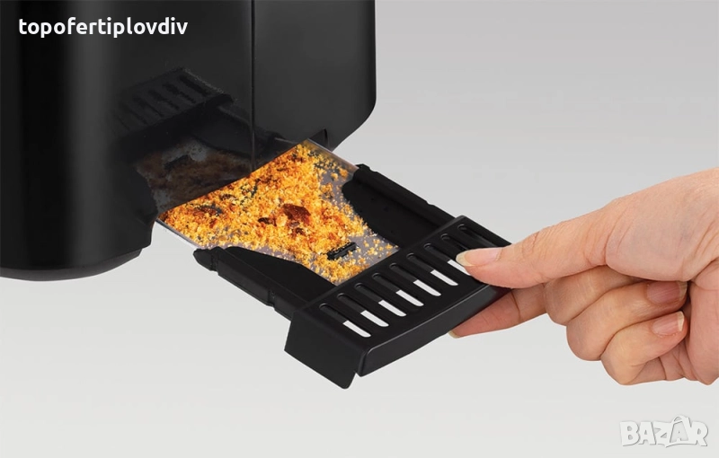 Подвижна тава за трохи улеснява поддържането на тостера чист, а отделението за съхранение на кабела улеснява съхранението на уреда, което помага да поддържате кухненския плот подреден, така че кухнята ви винаги да изглежда естетически приятна.