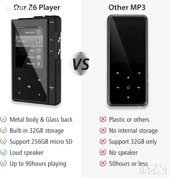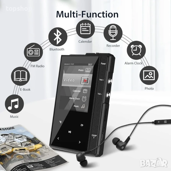 ♪-【Високоговорител и стерео звук】: Нашият Z6 Bluetooth MP3 плейър с вграден високоговорител предлага силен стерео звук, а супер HD звукът ви позволява да се насладите на музикално удоволствие. Поддържа повечето аудио формати като APE, FLAC, MP3, OGG, AAC, ACELP, WMA, WAV, поддържа видео формати като AMV, AVI, можете да добавите отметки към аудиокнига. Поддържа също FM радио и гласов рекордер.