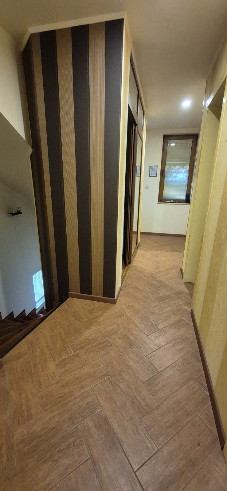 Втори етаж: вътрешно стълбище, две самостоятелни спални на юг, перално помещение, дрешник, баня с тоалет и панорамен балкон.