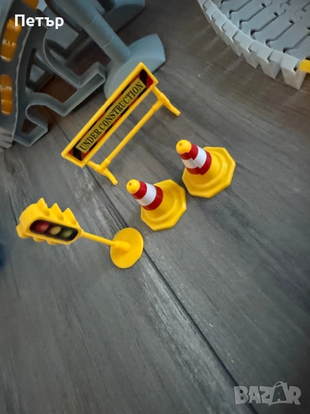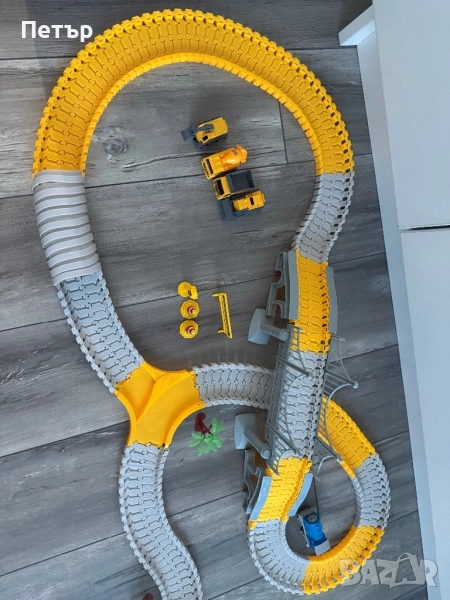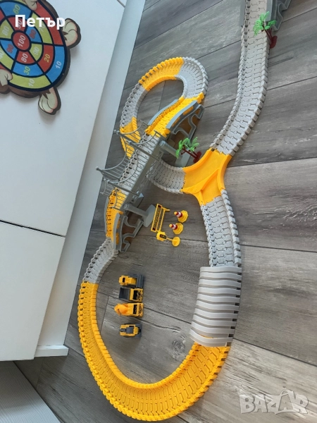 Продавам страхотен строителен комплект с писта за камиони. Пистата е в жълто и сиво, с мост, издигнати участъци и кръгови завои. Включени са 3 строителни машинки – бетоновоз, самосвал и валяк, както и малки