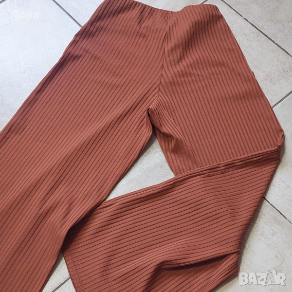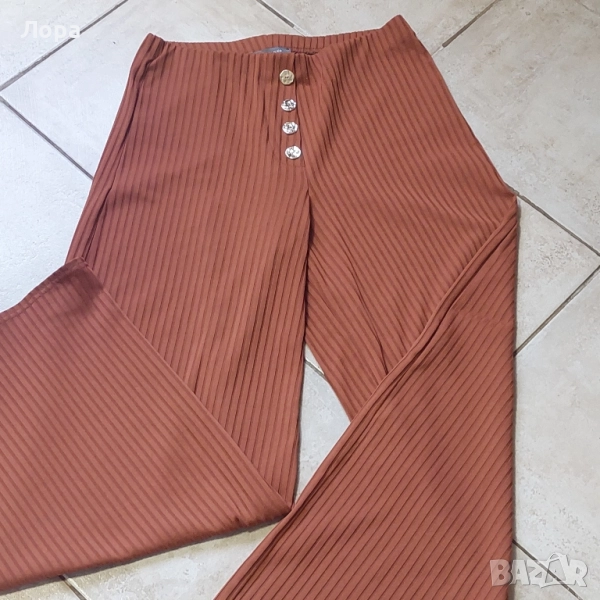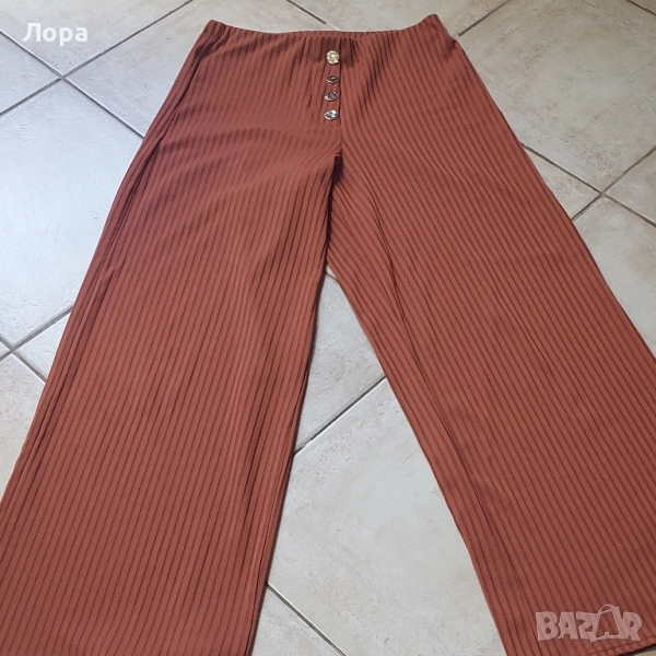 Дамски еластичен панталон с ластик в талията. Декоративни копчета в златисто. Широки крачоли. Размери ширина на талията едностранно от 36 до 63 см. Ханш от 56 до 73 см. Дължина от талията до долу 100 см. От чатала до долу 77 см. Панталона е нов не е носен.