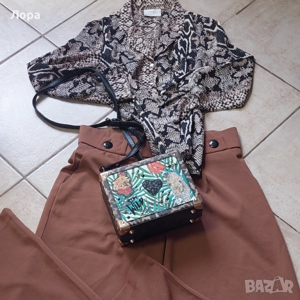 Комплект дамски еластичен панталон с ластик в талията и риза змийски принт. Размери на панталона ширина в талията едностранно от 42 до 55 см. Ханш от 60 до 70 см. Дължина от талията до долу 102 см. От чатала до долу 77 см. Размери на ризата ширина от мишница до мишница 52 см. От рамо до рамо 39 см. Дължина на ръкава 56 см. Дължина на ризата 57 см. Без забележки