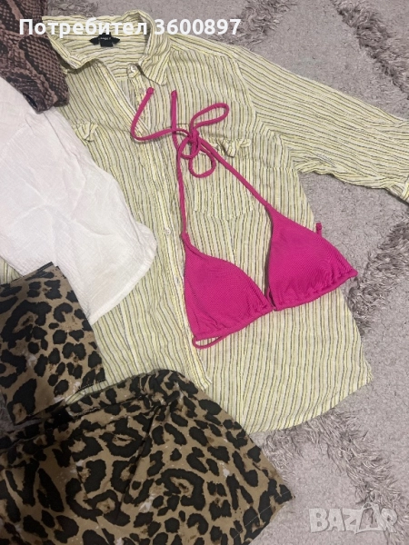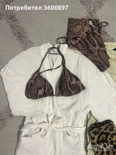 Плажен сет от: един комплект бански, горнище на бански, плажен леопардов сет, два вида парео( бяла/жълта ризка/рокля). Всичко се продава в комплект.
