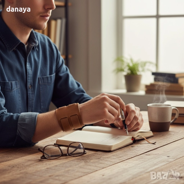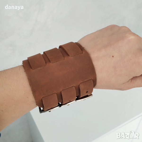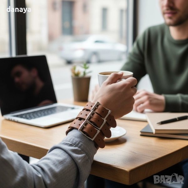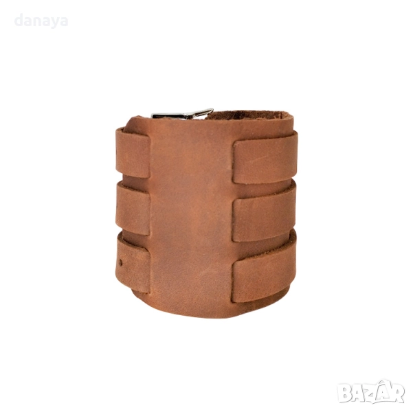 Мъжка кожена гривна в кафяв цвят – стилен аксесоар, който подчертава характера и индивидуалността. Изработена от еко кожа с три метални катарами, които осигуряват стабилно и регулируемо закопчаване. Широкият дизайн тип маншет придава на гривната изразителен и модерен вид, подходящ както за ежедневието, така и за специални поводи.