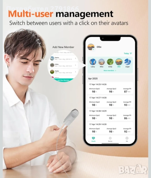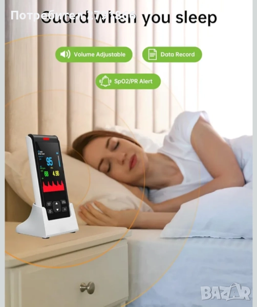 - Нощният пулсов оксиметър разполага с режим за 10 потребители, позволяващ на 10 души удобно да наблюдават, проследяват и съхраняват своите показания за кислород на едно и също устройство, като всеки потребител може да записва до 300 набора от данни, включително дата и час.