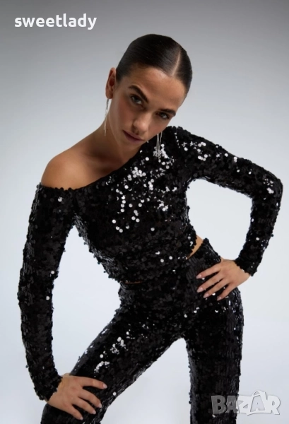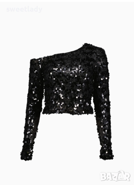 Черна официална блуза с пайети с едно рамо. Елегантен модел подходящ за всякакви поводи : за парти, за вечер, за среща.