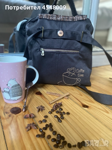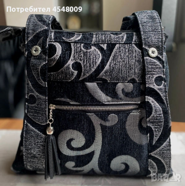 2. Материята - тъмно-кафяв памулен плътен и стабилен плат в съчетание с тъкана материя, тип дамаска. Дръжката позволява да се носи като чанта през рамо или през тялото, или като раница.