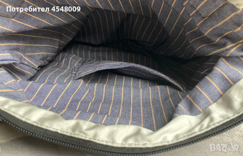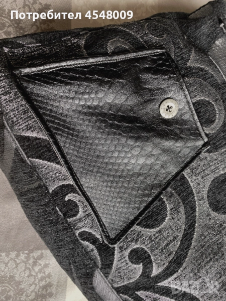 Основната част е от плътна памучна материя със зърнеста текстура в топъл бял нюанс. Материята е устойчива на износване и запазва формата си. Предният джоб и горният кант са от плътен плат със сребриста нишка, имитация на животинска шарка – мека на допир, стабилна и леко релефна. Отзад е "снабдена" с дълбок джоб с цип, а бродерията добавя усещане за автентичност и различен поглед (ама буквално си е поглед ;)), подсилено дъно. Дръжките са от тапицерски жакард с лек метален отблясък и голяма здравина, а закопчаването е с цип по цялата дължина.