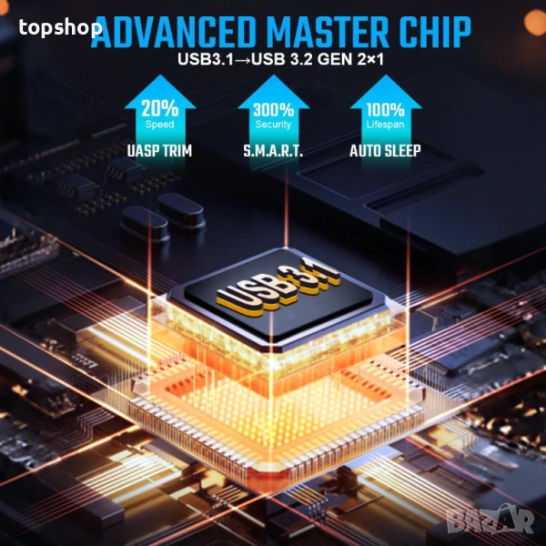 【ВИСОКОСКОРОСТНО ПРЕДАВАНЕ】M.2 SSD корпусът е оборудван с най-новия USB 3.1 Gen 2 интерфейс, който е обратно съвместим със стандартите 3.1 Gen 1 и USB 3.0. Той поддържа функции UASP, TRIM и SMART, със скорост на трансфер до 10 Gbps, което позволява мигновено прехвърляне на големи файлове, видеоклипове с висока разделителна способност и друго съдържание. Забележка: Действителната скорост на трансфер зависи от скоростта на SSD устройството и типа на USB порта.