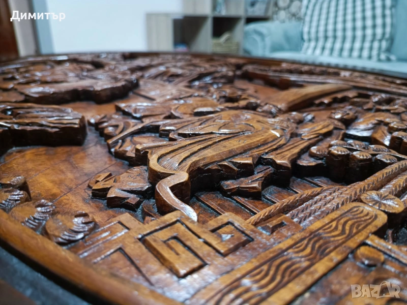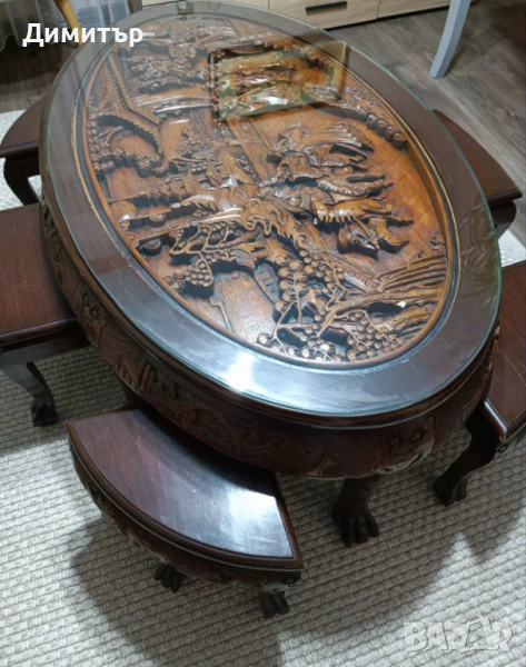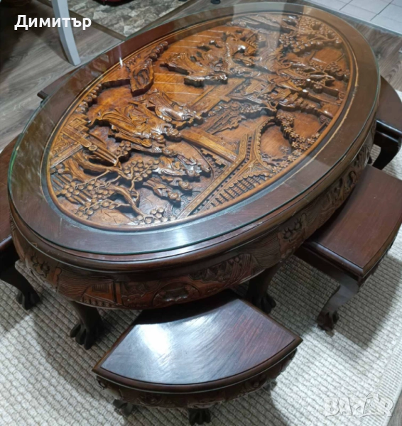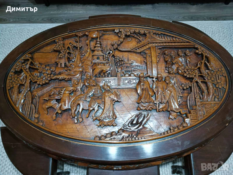 - Произход: Япония – автентична изработка от периода Шова, ценена от колекционери и интериорни дизайнери. Този период се съчетават японски техники с влияния от западния дизайн. Майсторите от този период често използват висококачествени дървесини като череша, кипарис и палисандър. Гравираните сцени, които се виждат на масата са типични за декоративни мебели от ранния период на Шова.