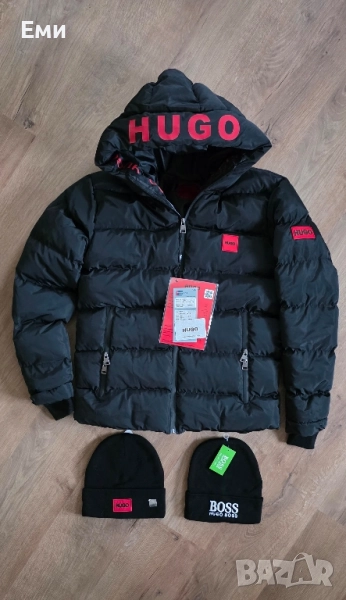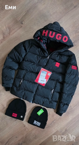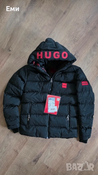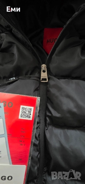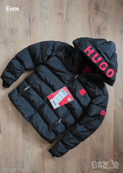 Мъжко зимно яке Hugo Boss. Черен цвят с червено гумирано лого и на ръкава С надпис на качулката С надписи от вътрешната страна на ципа С ципове на джобовете