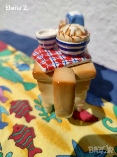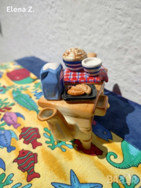 Ръчно изработен, с колекционерска стойност, този малък чайник за един човек е изработен във формата на дървена масичка с чекмеджета със златни дръжки, на която има пакет захар, и два печени сладкиша, чашка с мляко и сладка карирана покривчица (която е и капачето).