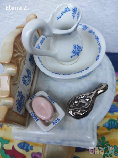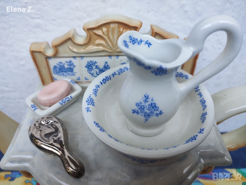 Голям керамичен чайник за 4-5 чаши чай, на Cardew Designs ръчно изработен, рисуван и декориран като викториански умивалник, с елегантна порцеланова кана и леген като капаче, и със сребърна сапуниерка, сапунче и четка за коса, всички майсторски изработени от екипът на Paul Cardew. Чайникът има дупка отзад за закачане на стена. Маркиран е.