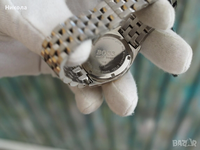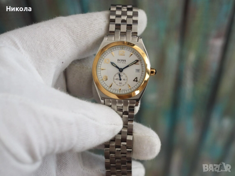Hugo Boss, изработен в Швейцария, корпус от 32 мм, полиран двуцветен финиш и изчистен циферблат с дата и малък секундарник.