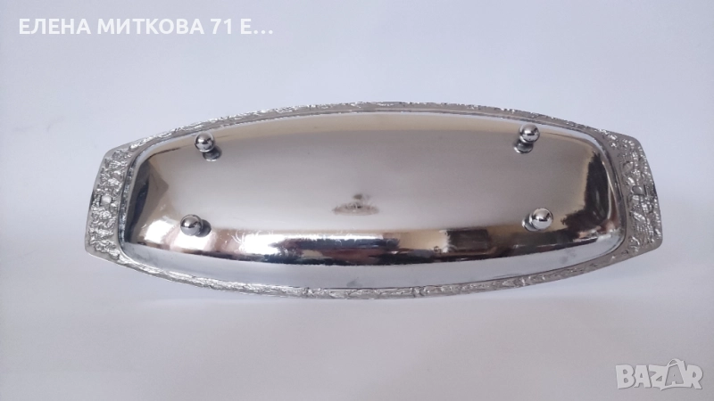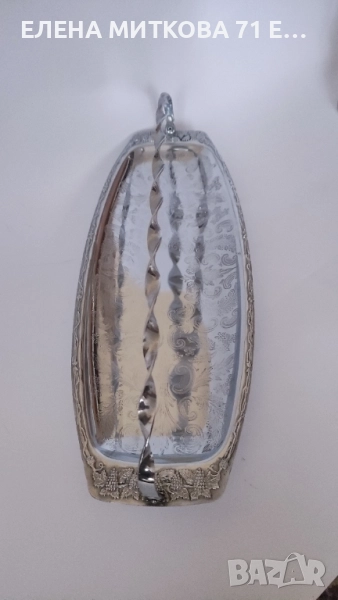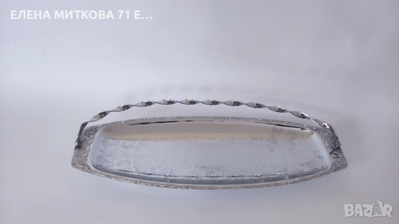 Голямо винтидж метално плато с подвижна дръжка-гравирано дъно,релефни орнаменти по края,с четири топчести крачета