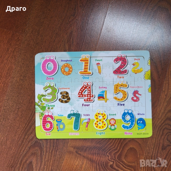 Цена за дървения пъзел, при който от 3 части се "събира" една цифра - 10 лв.