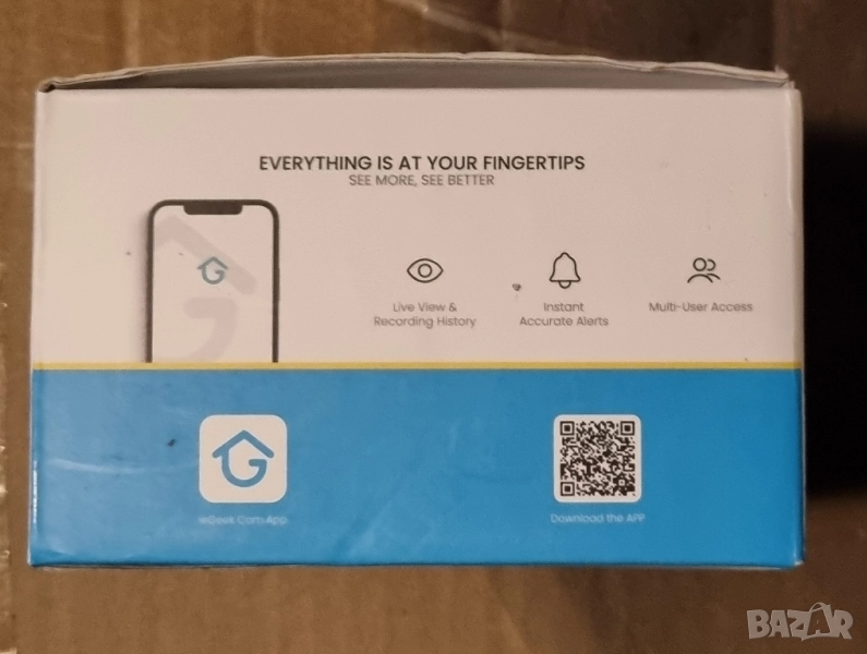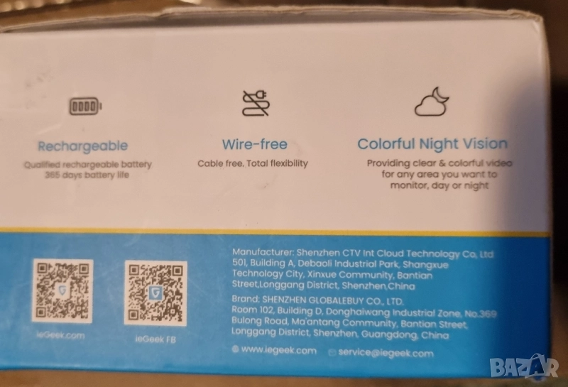 2 режима на съхранение. Режими на съхранение камерите ieGeek поддържат 32~128GB Micro SD карта (не е включена) и осигуряват 7 дни безплатно съхранение в облака. Персонализиране на 5 зони, за откриване, намаляне на фалшиви аларми. Многопотребителско дистанционно управление Споделяне със семейството ieGeek камерата поддържа неограничен брой потребители, които могат да гледат видеоклипове на живо, за да знаят какво се случва около къщата ви. По-интелигентно откриване с изкуствен интелект. Намалете фалшивите аларми PIR сензор, комбиниран с AI анализ, осигурява 99% точност, фокусирайте се само върху това, което наистина има значение. PIR детектор за движение Чувствителност от 1 до 10 нива Оборудван с PIR сензор за движение, гъвкави настройки нивото на чувствителност на детекцията от 1 до 10. Сигнали в реално време. Той задейства алармата на прожектора, интелигентната сирена и приложението, за да отблъсне нежеланите гости. История на видеоклиповете Интелигентно и бързо възпроизвеждане. Намирането на цялото събитие от началото до края е значително по-лесно благодарение на интелигентните филтри и времевата линия. Персонализиране на времето за известяване. Удължете времето за използване на батерията. Задаване на времеви план за аларма при откриване на движение, за да се спести енергия на камерата и да се избегнат безсмислени аларми. Технически спецификации: Видео резолюция 2K 3MP (2304*1296). Видео компресия H.264. Цветно нощно виждане 10 м. Нощно виждане 15 м. Зрително поле Д:120°, В:100°, В:51° PIR детектор макс. 10м. Чувствителност на детекцията на движение нива от 1 до 10 Интелигентно откриване лице/превозно средство/домашен любимец/рратка. Персонален график за аларми. Алармена зона. Капацитет на батерията 5200mAh Захранване DC 5V/2A Поддържа съхранение в облак и 128GB SD карта. Запис, задействан от движение. ПРИЛОЖЕНИЕ CloudEdge/ieGeek камера Мрежова връзка 2.4GHz Wi-Fi Двупосочно аудио Споделяне с множество потребители Водоустойчива IP65