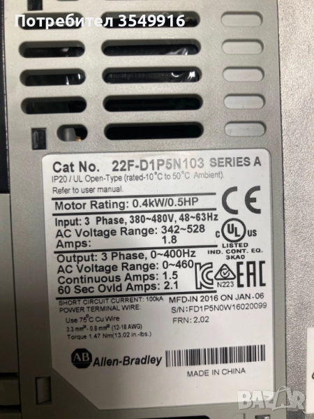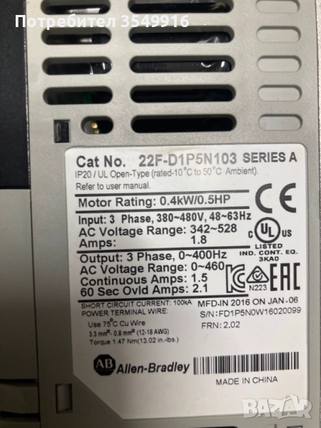 Честорен регулатор Allen Bradley 0,4 KW Модел 22F-D1P5N103 Вход 3PH 380-480V 50/60Hz 1,8A Изход 3PH 0-460V 0/240Hz 1,5А