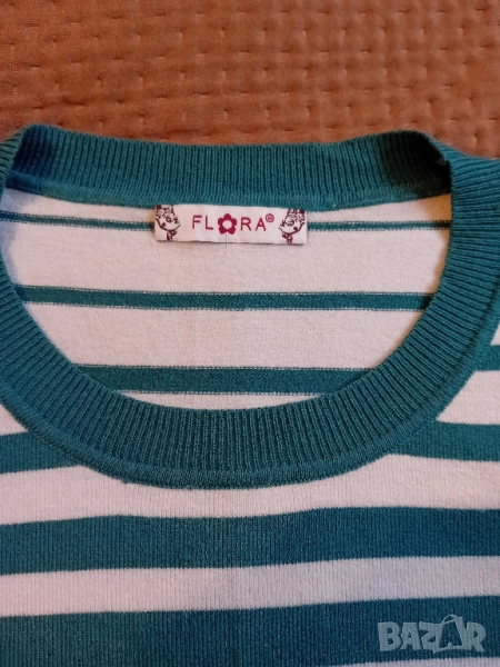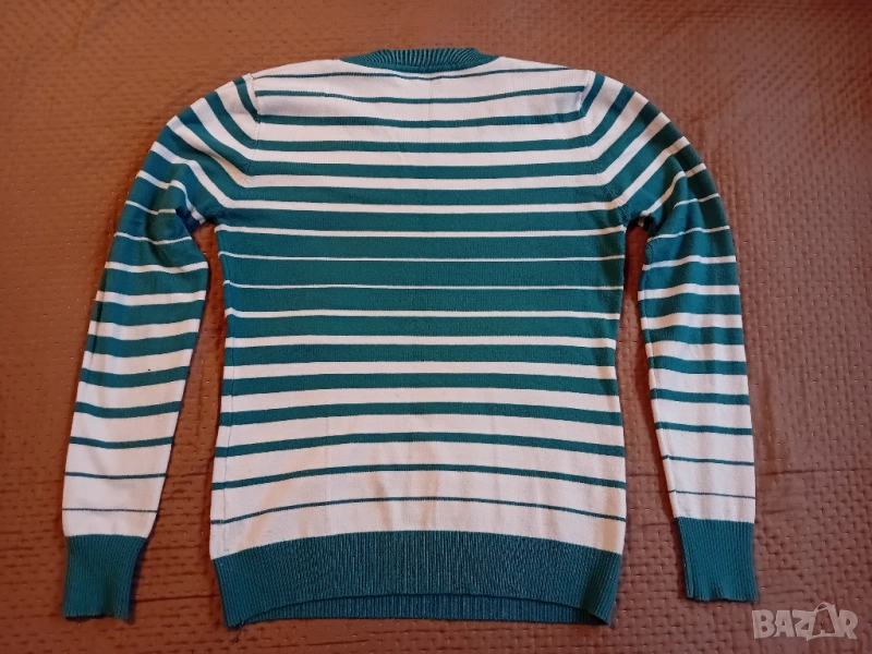 Дамски пуловер в зелено и бяло.РазмерS/M.Дължина 57,ширина между подмишници 43см,дължина ръкав 57см.