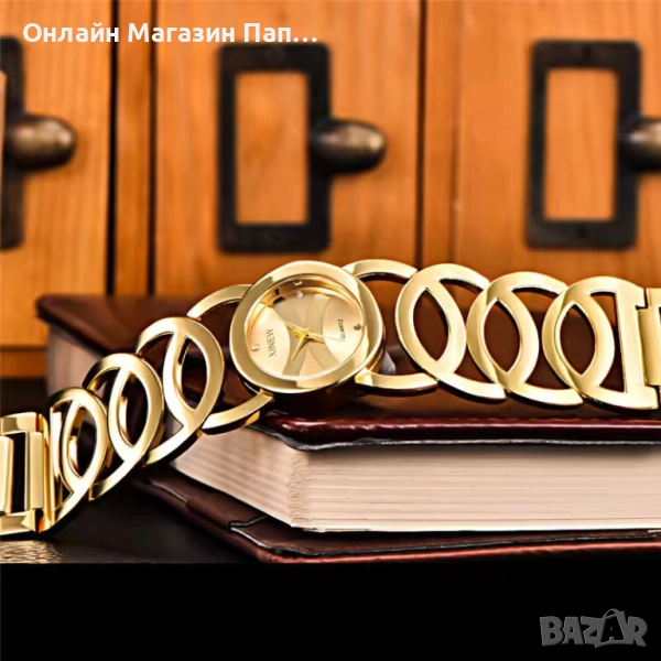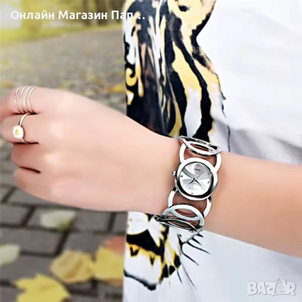 Корпусът е с кръгла форма без цифри, което придава модерен и изчистен вид. Уникалната гривна с преплетени кръгове превръща часовника в елегантно бижу, което украсява ръката с финес.