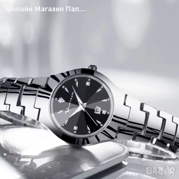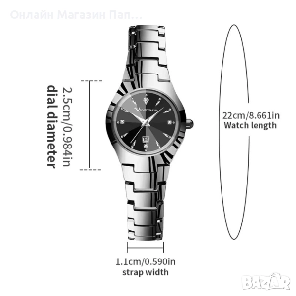 Изработен от висококачествена волфрамова неръждаема стомана, часовникът впечатлява с черен циферблат и диамантено стъкло Hardlex, което придава изключителен блясък и устойчивост. Компактният циферблат с диаметър 25 мм подчертава елегантността, а сгъваемата закопчалка със заключване осигурява стабилно и удобно носене.