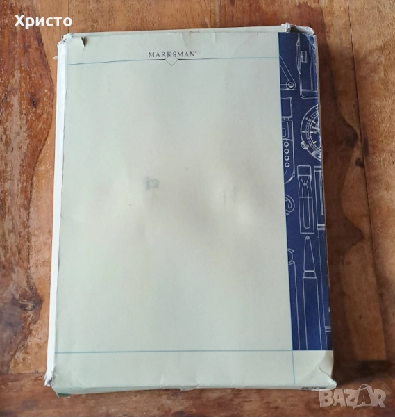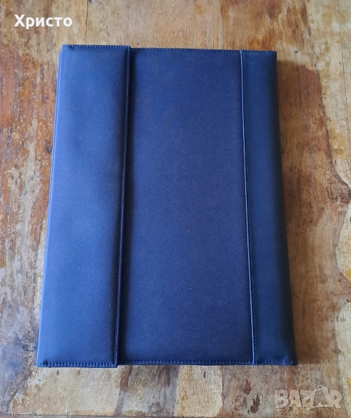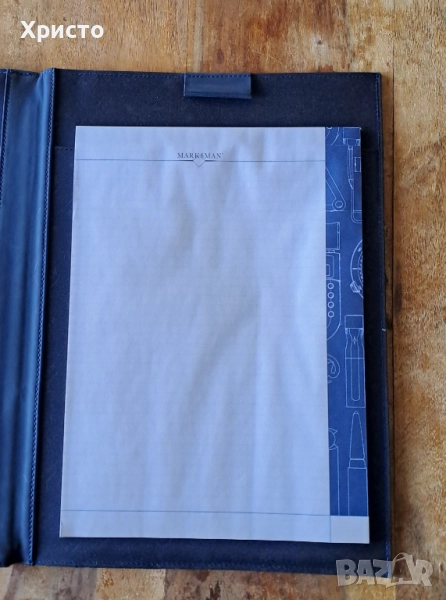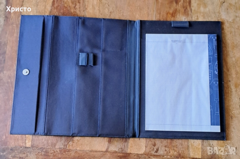 чанта бизнес папка луксозна за документи синя Марксман Marksman Размер А4. Има кожа на места. С 4 джоба за визитки и документи. Има 3 места за химикалки. Папката чанта се отваря с магнитни копчета отпред и отзад. Бележникът за писане с редове е с размери 21x29.5 см и има 30 листа. Папката е с размери 36.5x27x2.8 см. Чисто нова. В оригиналната кутия, която не е в перфектно състояние. От частна колекция. За ценители.