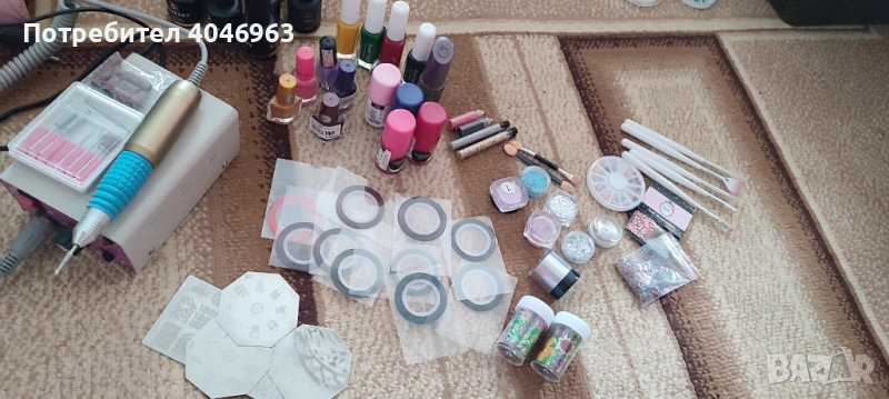 Електрическа пила с няколко приставки и резервни детайли за приставките, прахоуловител за маникюр + 4 вида пигментни пудри + три опаковки с разни камъчета за маникюр+ няколко бр. четчици за декориране по маникюр + 5 вида брокати+2 вида конфетки+2 вида цветно фолио +10 вида цветни ленти за маникюр +4 вида плочки за печати на различни декорации +13 бр.обикновени лакове за декориране+1бр.база + 1 бр.топ за запечатване + 1 бр. топ за матиране на гел лак +5 цвята гел лак . Всичко е добре съхранявано,работещо,почистено и готово за новия ползвател .
