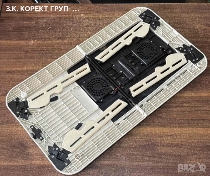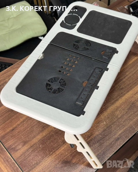 Продавам преносима масичка за лаптоп. Удобна и сгъваема, като може да бъде използвана и в легло като има пространство за допълнителни аксесоари към лаптопа и поставка за чаша.