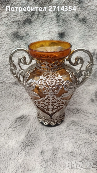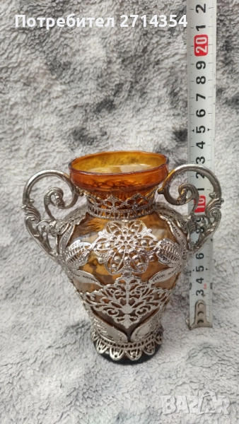 Стара автентична ваза със кехлибарено стъкло и филигранно покритие.За повече информация пишете.