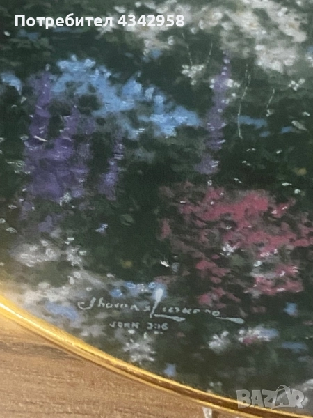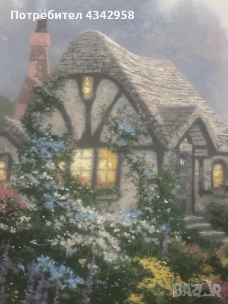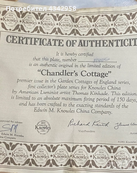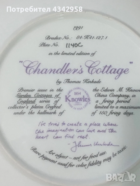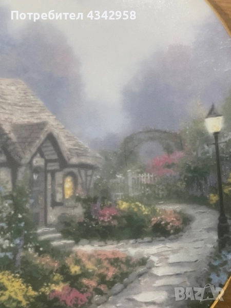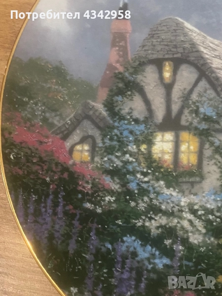 Тази колекционерска декоративна чиния изобразява картината на Томас Кинкейд „Къщата на Чандлър“.