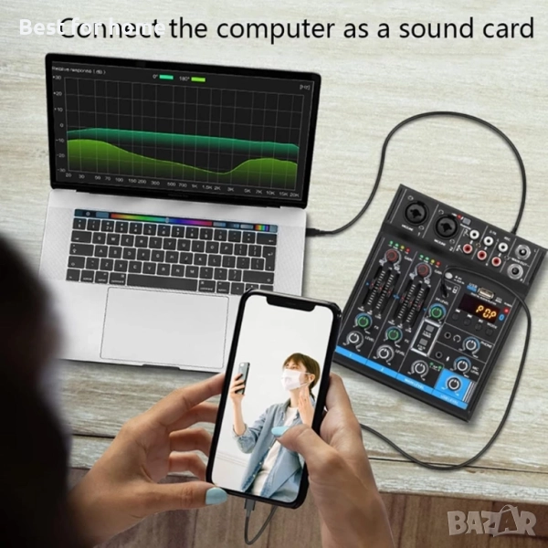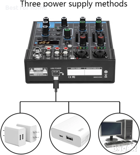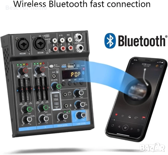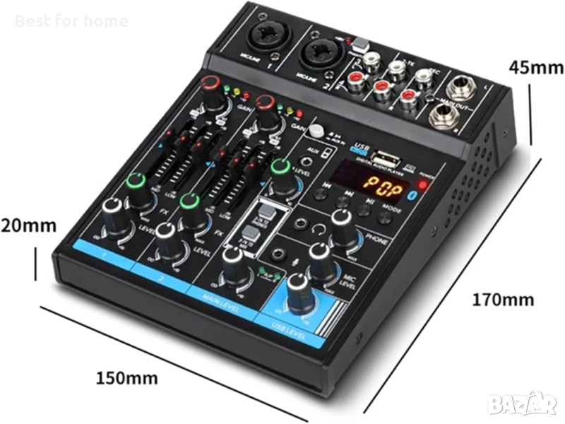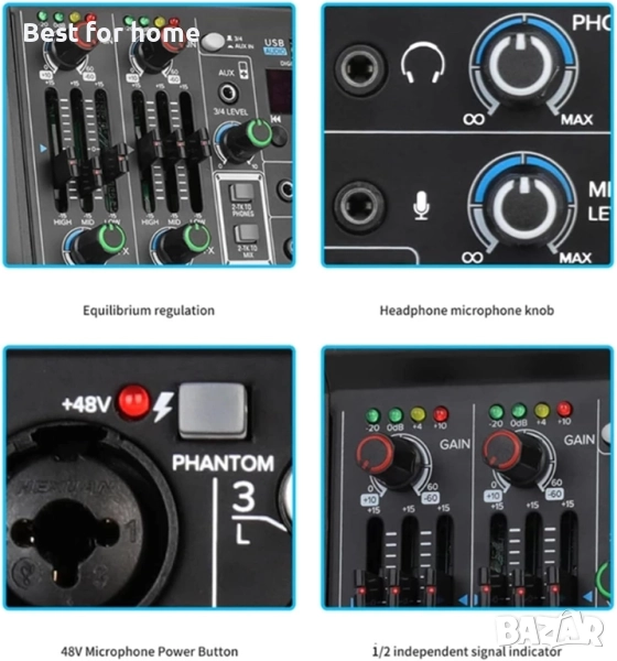Професионален 4-канален миксиращ пулт с Bluetooth съвместимост и звукова карта, 3,5 мм жак за слушалки, бутон за захранване на микрофона 48V, индикатор за 1/2 независим сигнал.
