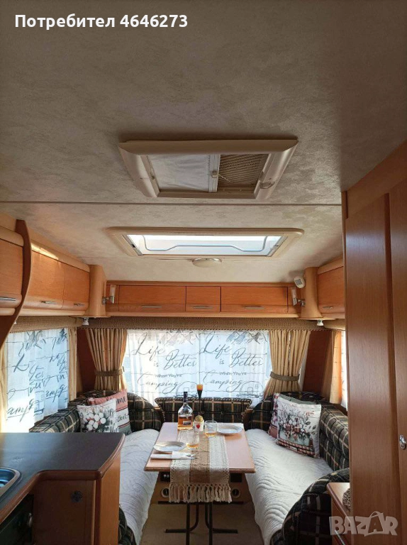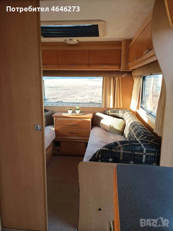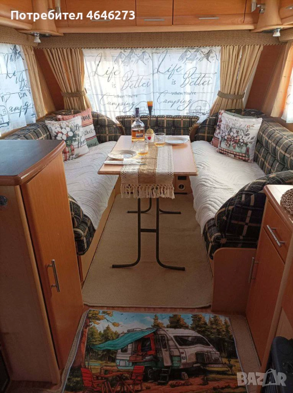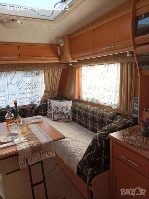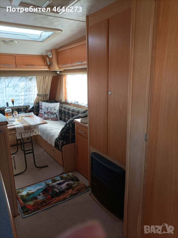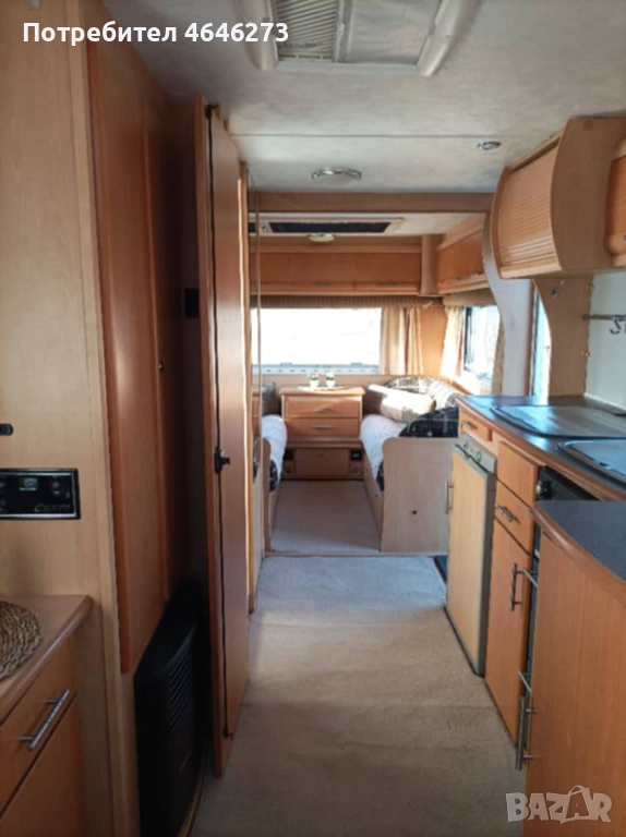 Караваната има 2бр.сепарета с две сгъваеми масички,който се прибират в шкаф.И двете сепарета стават на спални.Допълнителни,прибиращи се 2бр.легла подходящи за деца.Към едната спалня има плъзгащи врати.Брой общо спални места 6+1.Подходяща и за по-голямо семейство.