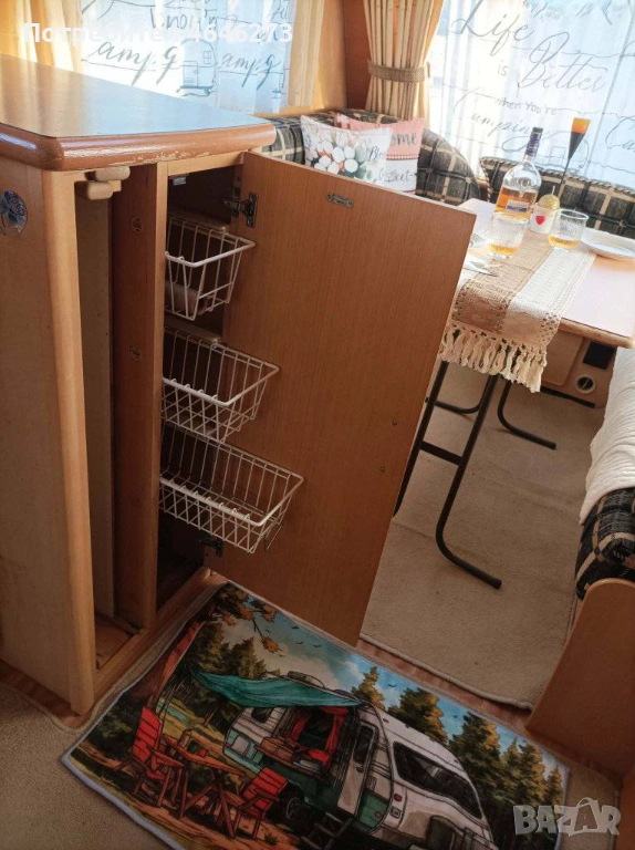 Оборудвана с баня и химическа тоалетна.Бойлер на газ.Отоплителна печка ,към която има 4 бр.въздуховоди към спалните.Гардероб.Готварска печка-4бр котлони с фурна и грил,както и шкаф за готварски съдове към нея.Мивка.Хладилник.Има и вградена стереоуредба.MPPT контролер със слънчев панел 350 вата.Инвертор 500 вата,който може да захранва телевизор 220 волта.Щори,комарници на всички прозорци и люкове.Вентилатор(аспиратор),който смуче или нагнетява въздух.Микровълнова печка вградена в шкаф.Вътрешен резервоар за вода с електрически нивомер ,чрез който се следи нивото на водата.Има 2 бр.газови бутилки(основна+резервна).Съдове външни 2бр.за вода оригинални с помпа,която качва водата във вътрешният резервоар.Резервни колела 2бр.Набор от техническа документация за подръжка и експлоатация на уредите.