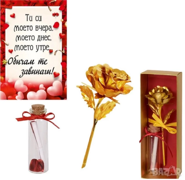 Подаръчен комплект - Обичам те! със златна роза и послание