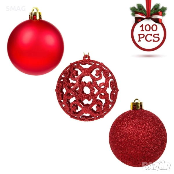Впечатляващ комплект от 100 коледни топки в три размера с матово, блестящо и перфорирано покритие с брокат. Идеални за украса на големи елхи, празнични венци и декорации. Придават стил, блясък и празнично настроение на всеки интериор.