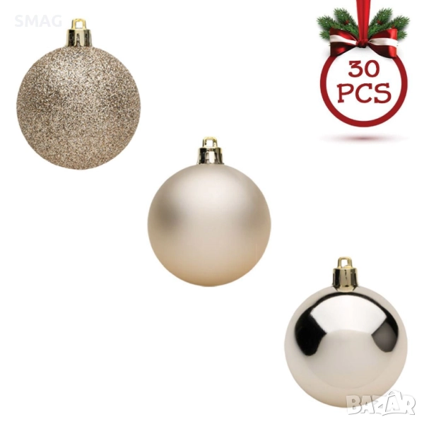 Комплект от 30 коледни топки в екрю цвят с матови, лъскави и глитер покрития, включително гирлянд. Идеални за украса на елха и празнични композиции, добавяйки блясък и елегантен акцент. Създават изискан и празничен вид във всеки дом.