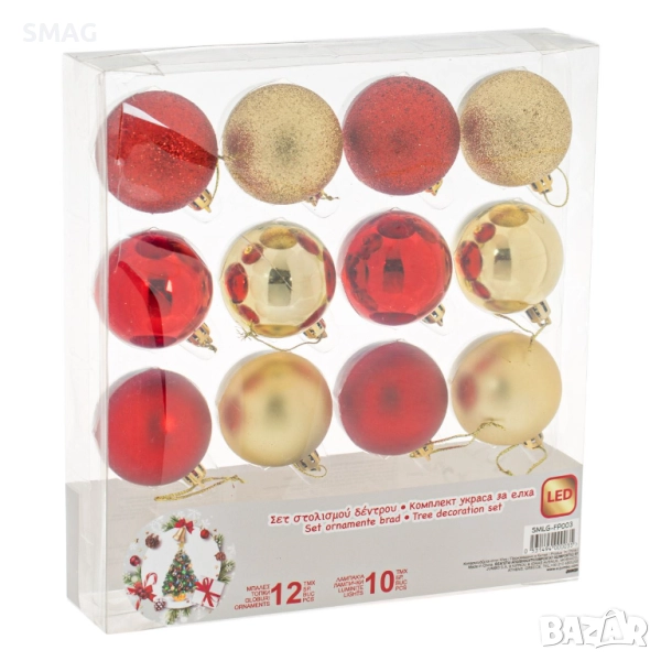 Комплект от 13 елемента за коледна украса, включващ 10 LED лампички и 12 топки в червено и златисто с матови, лъскави и брокатени покрития, Ø 5 см. Идеален за декорация на венци, клонки или малки настолни елхи, създавайки празничен блясък и уютна атмосфера.