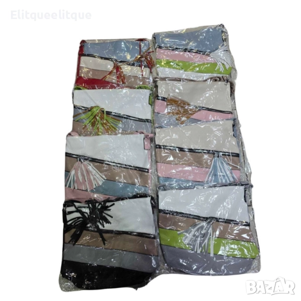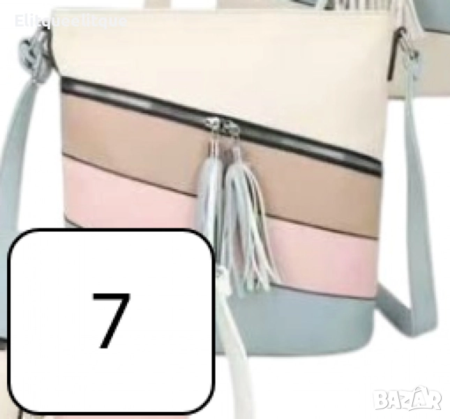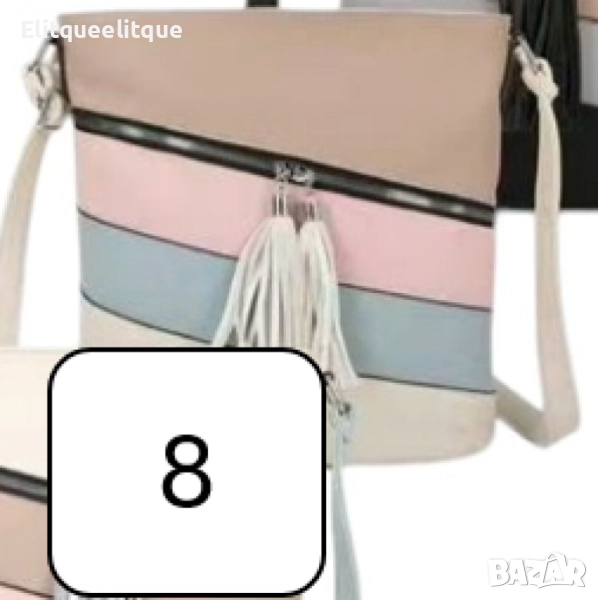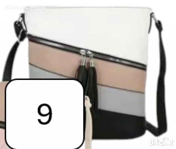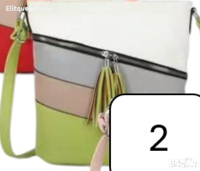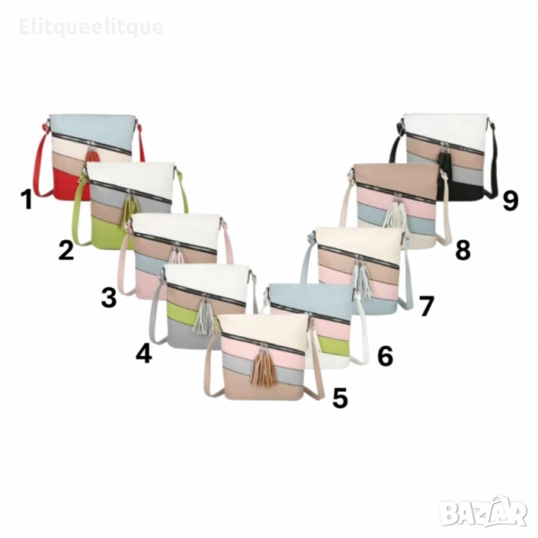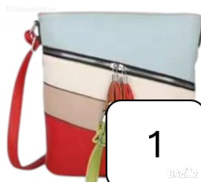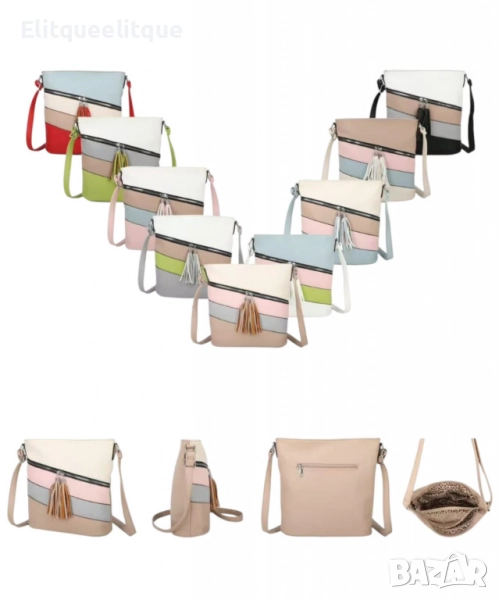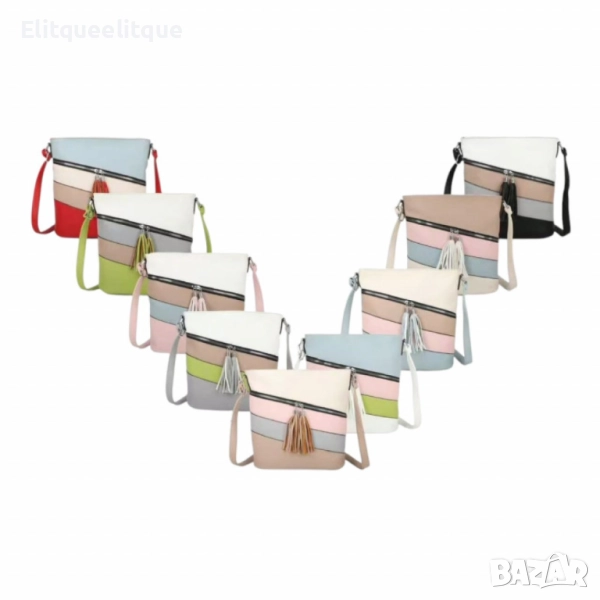 Дамска чанта с цип, цветни панели и декоративен пискюл