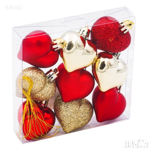 Комплект от 9 коледни орнаменти под формата на сърца в червено и златисто, матирани, лъскави и с брокат. Подходящи за украса на елха, гирлянди или празнични аранжировки, създавайки елегантен и празничен вид.