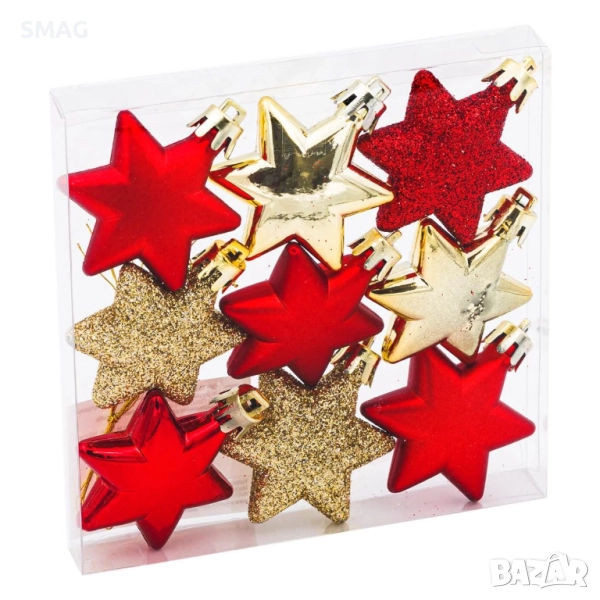 Комплект от 9 декоративни звездички за коледна елха в червено и златисто, комбиниращи матов, гланцов и брокатен ефект за празничен блясък. Идеални за създаване на уникална и ефектна украса на елхата.