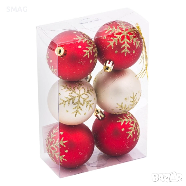 Комплект от 6 коледни топки за елха в червено и шампанско, матови и декорирани със снежинки от златен брокат. Създават празнична и елегантна атмосфера, добавяйки блясък и стил към вашата елха.