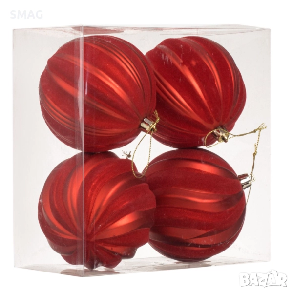 Комплект от 4 празнични топки за елха в наситено червен цвят с релефни райета и редуваща се кадифена текстура. Идеални за създаване на елегантна и уютна празнична атмосфера.