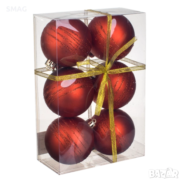 Комплект от 6 коледни топки в наситено червен цвят, матови и с брокат, подходящи за елегантна и празнична украса на елха.