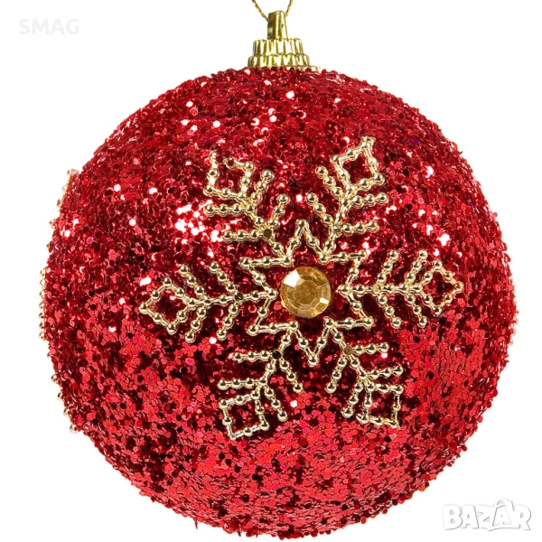 Комплект от 6 червени коледни топки, украсени със златисти снежинки, които придават празничен и елегантен вид на елхата.